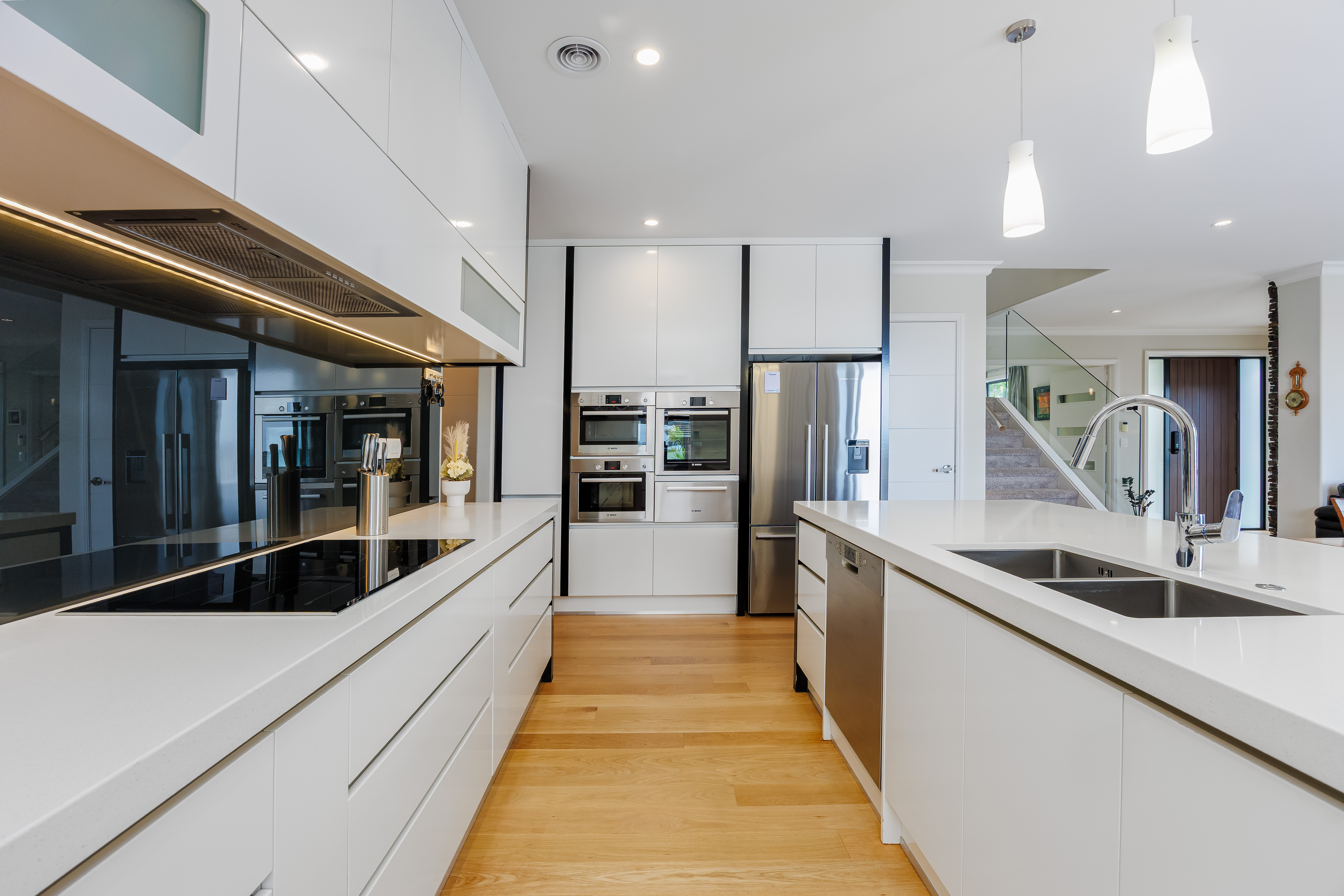 The formal lounge plus the open plan kitchen, dining, and living are positioned on the ground floor and flow out to the spacious deck with space to dine, entertain, or just lounge around. High-end appliances, stone benchtops, breakfast bar, and butler's pantry are just some of the features in the designer kitchen.