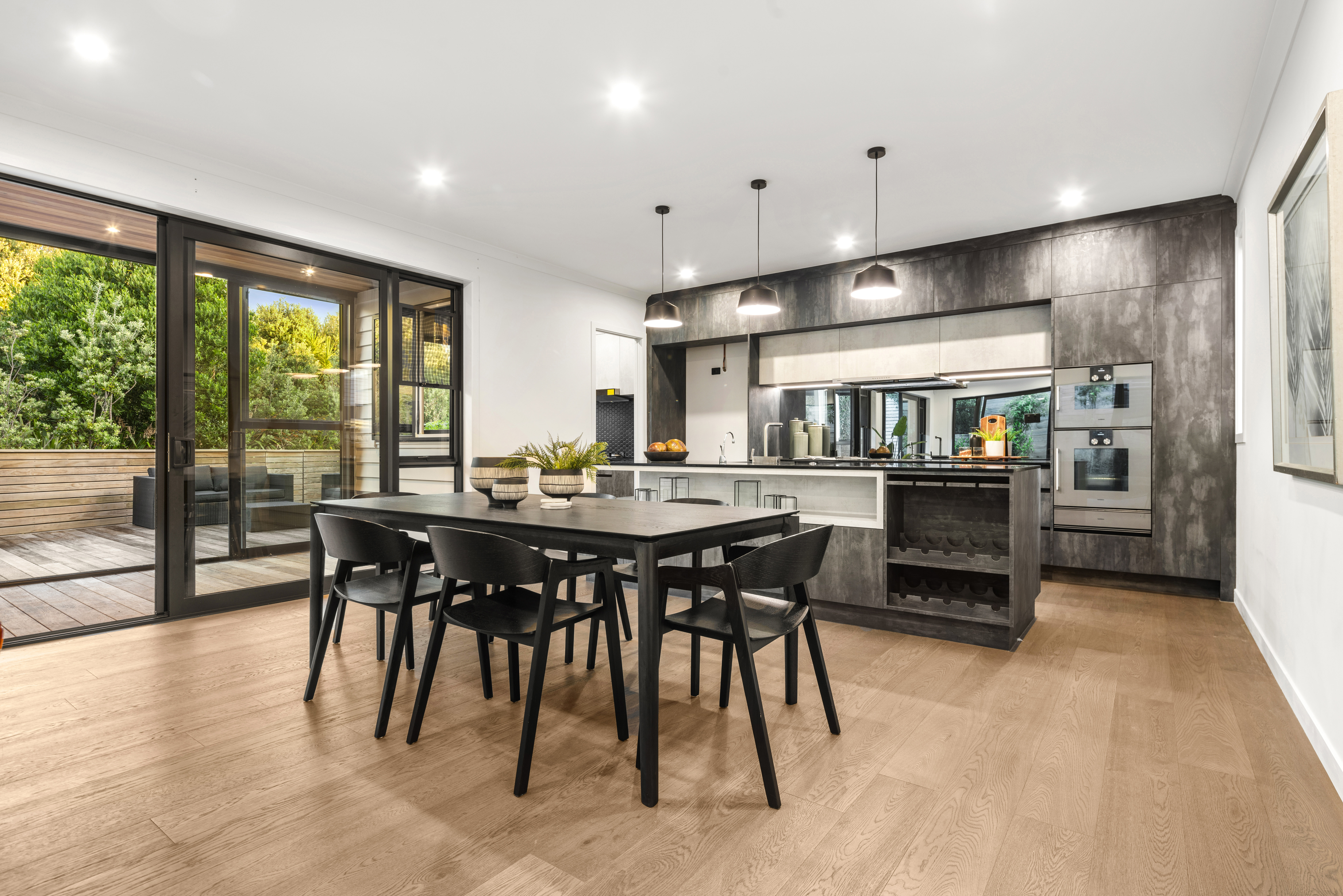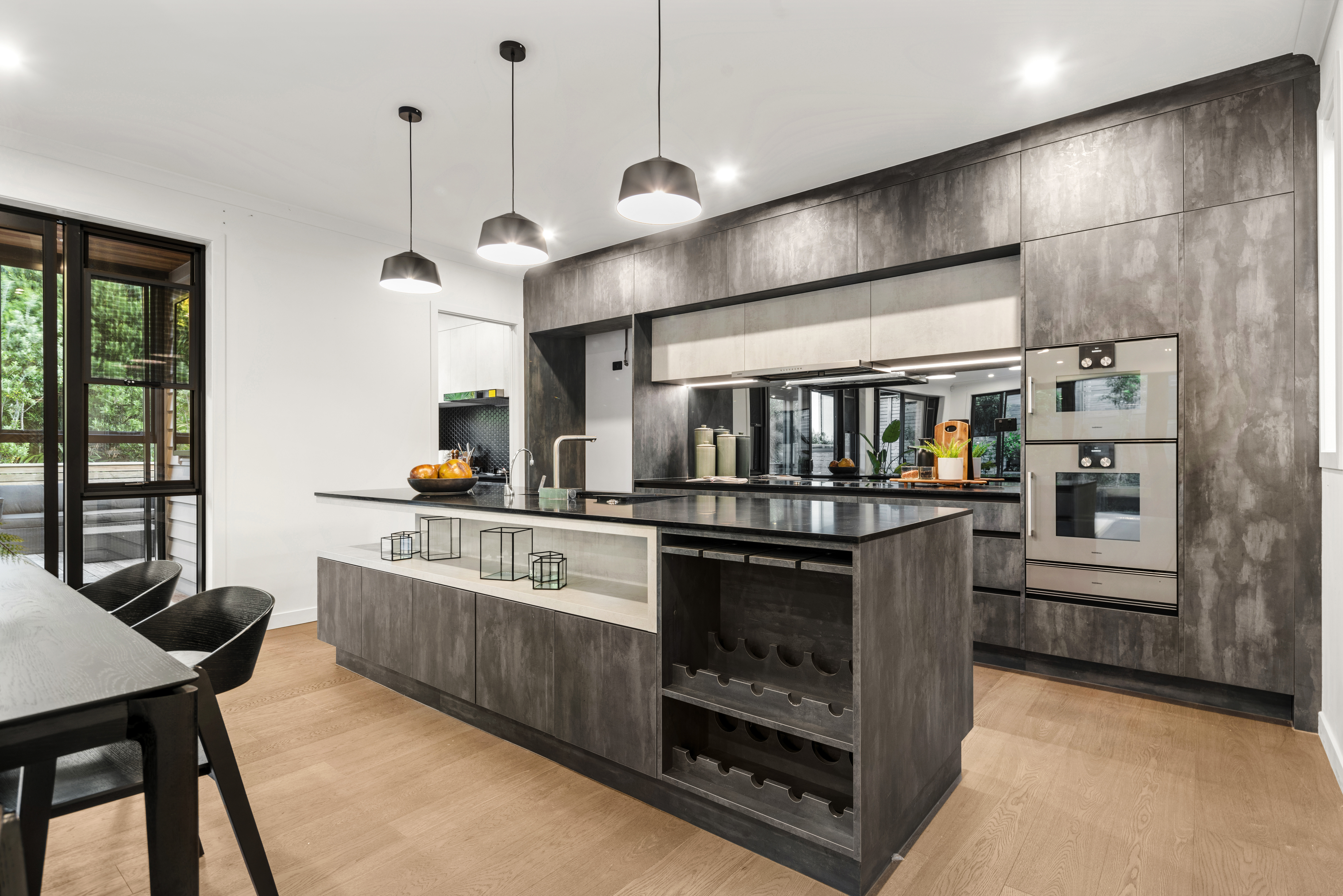 At the heart of the home lies a chef's dream kitchen, featuring premium Gaggenau appliances that combine professional performance with sleek, modern aesthetics. The German-made Hansgrohe sink, with its distinctive L-shaped wide rim, makes a subtle yet striking statement, minimalist, functional, and beautifully designed. A butler's pantry with sliding windows to the outdoor area enhances both convenience and entertaining flow, while the indoor/outdoor conservatory with feature lighting creates the perfect setting for gatherings year-round.