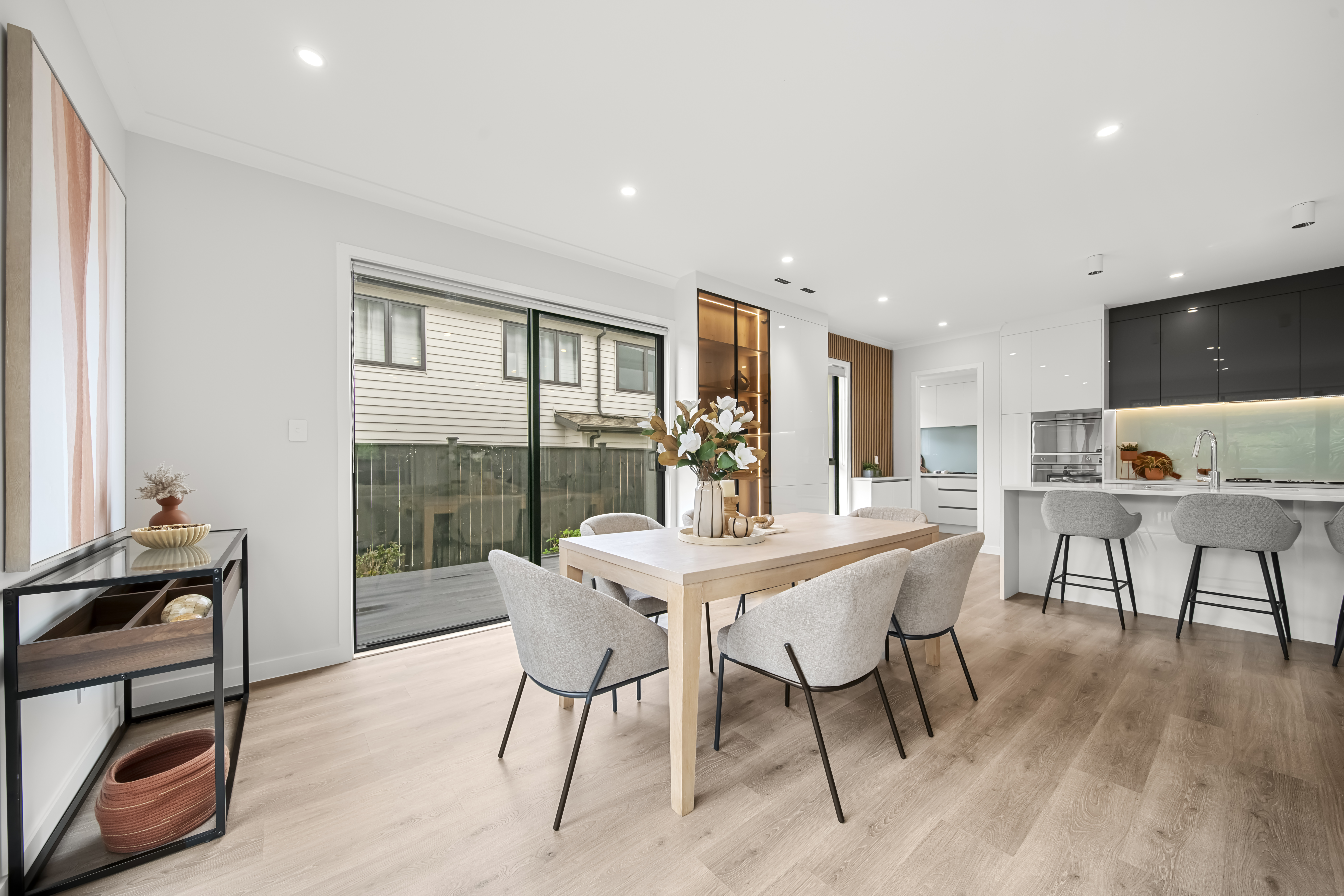 Upon entering, you'll find a beautifully appointed master suite conveniently located on the ground level, complete with a luxurious en-suite featuring a sleek shower. The modern designer kitchen forms the heart of the home, showcasing high-end finishes, a double oven, and a fully equipped butler's pantry with a gas hob and sink-perfect for seamless entertaining. The expansive open-plan kitchen, dining, and lounge area flows effortlessly to a massive sun-soaked deck, creating the perfect setting for alfresco dining and gatherings with friends and family.