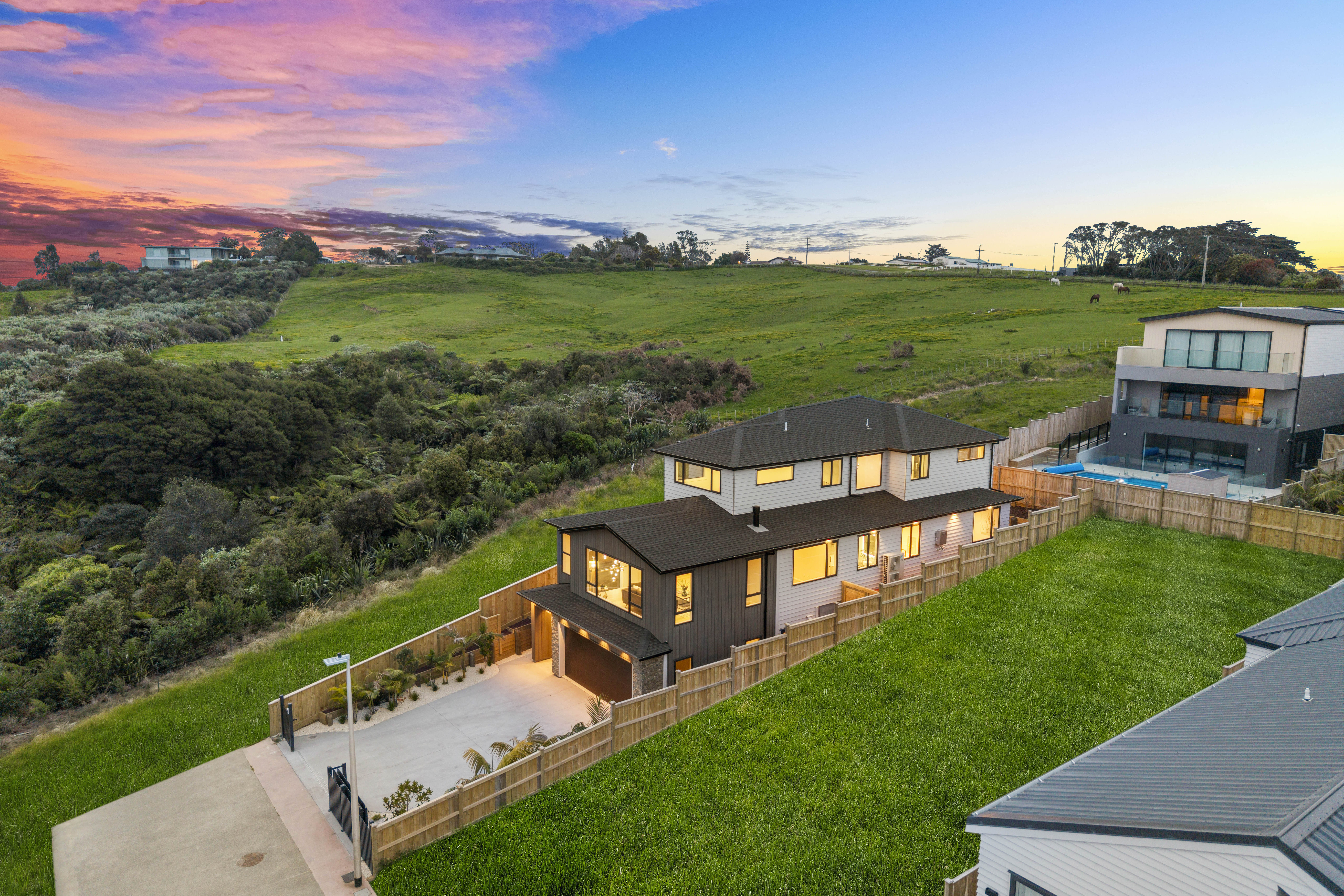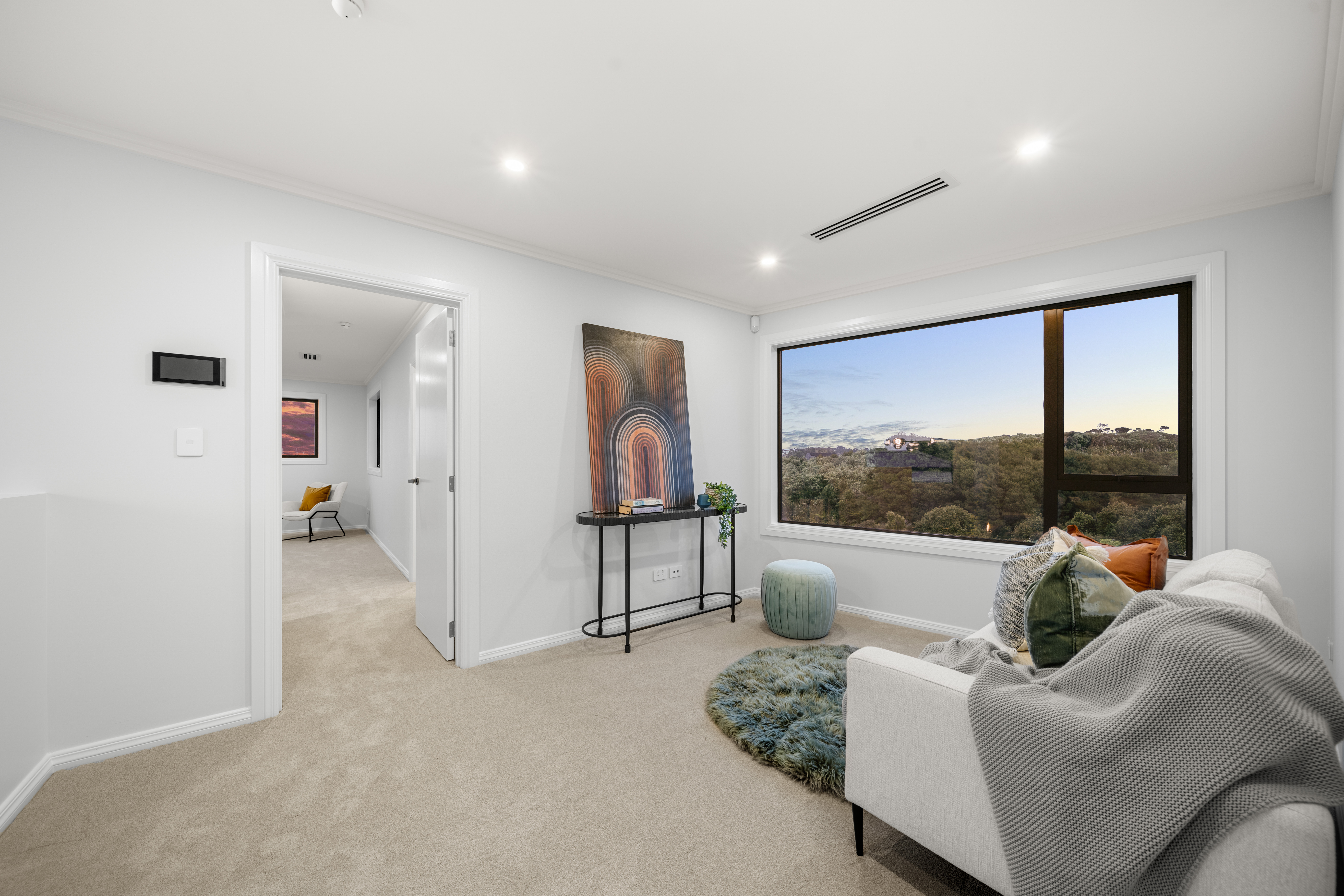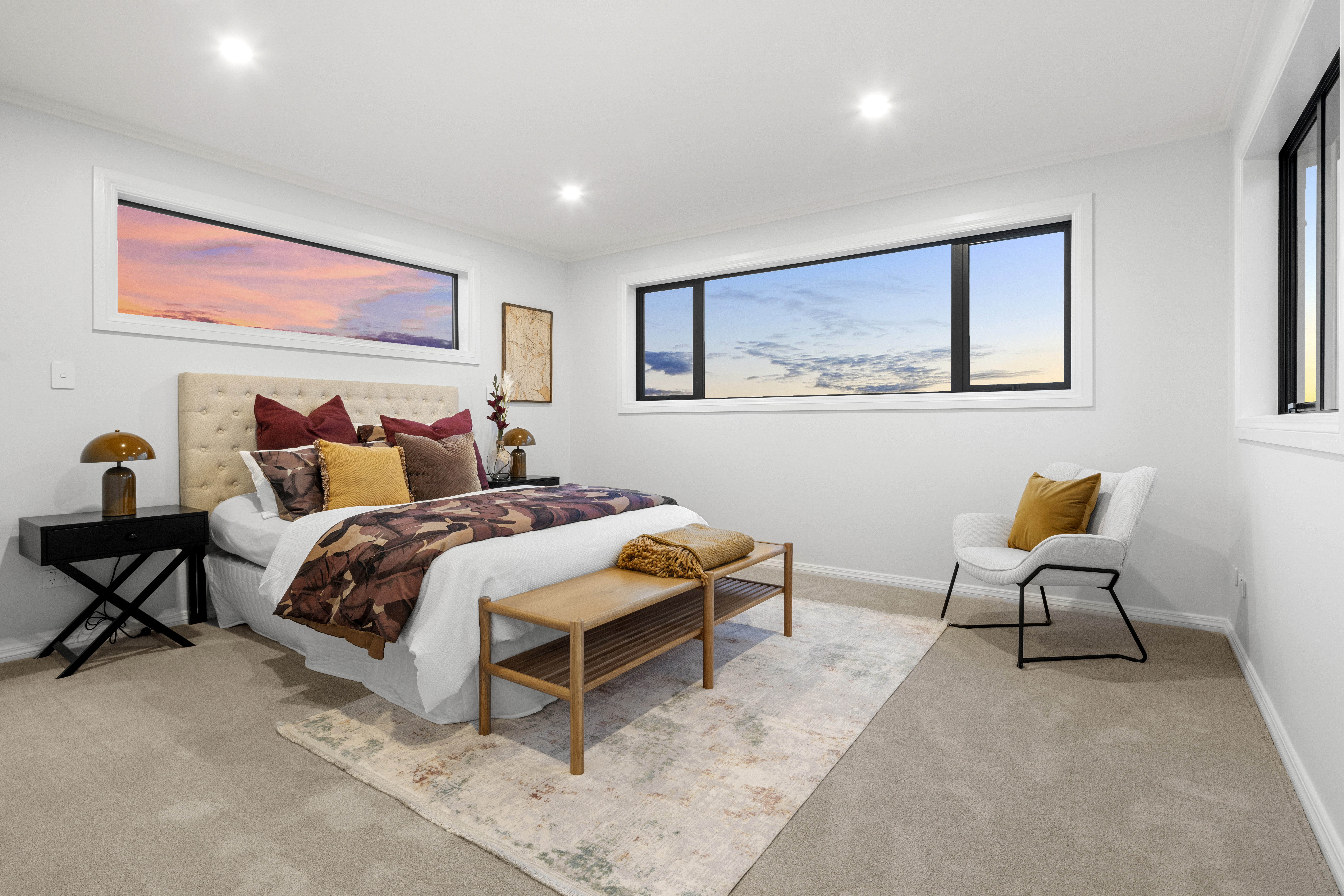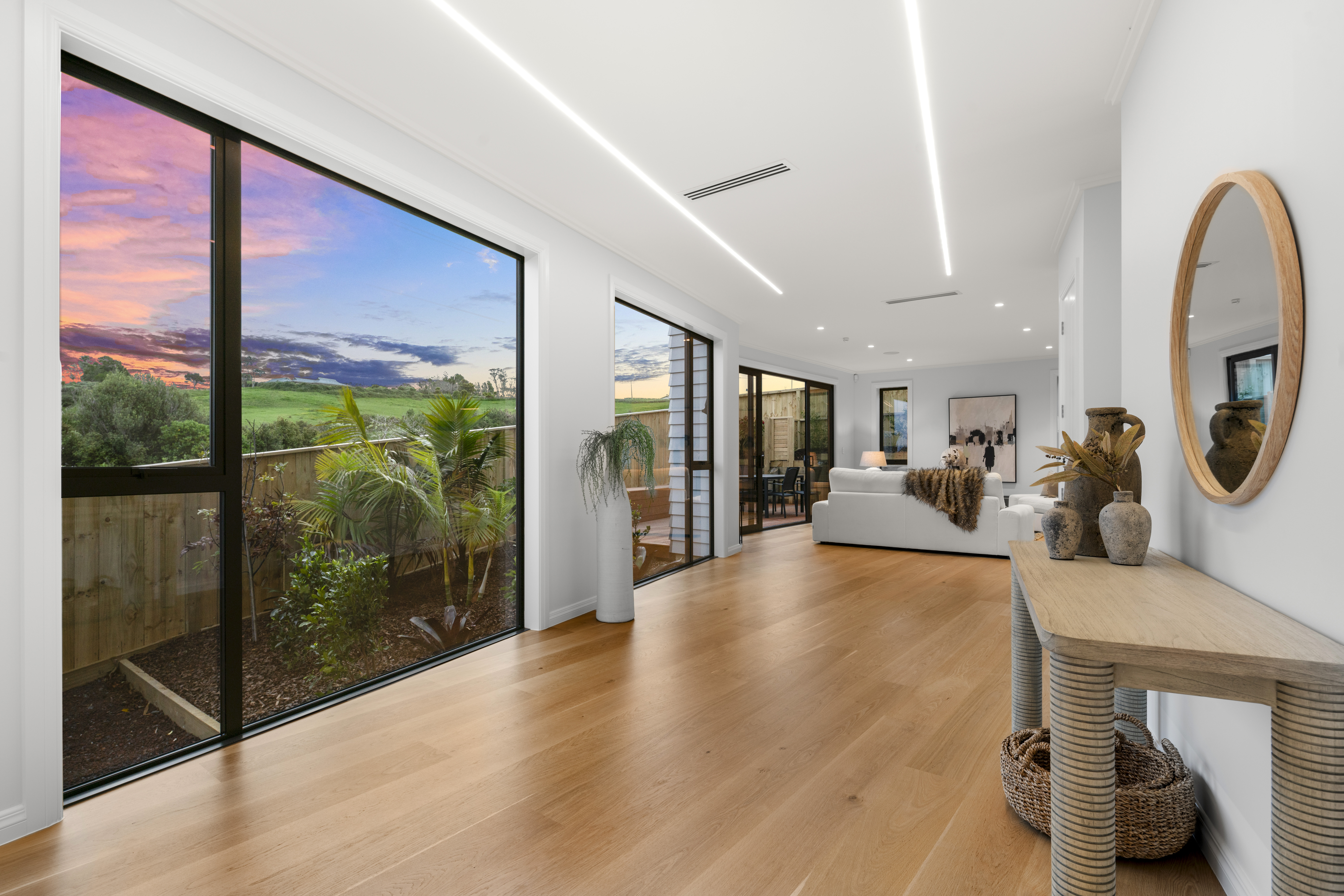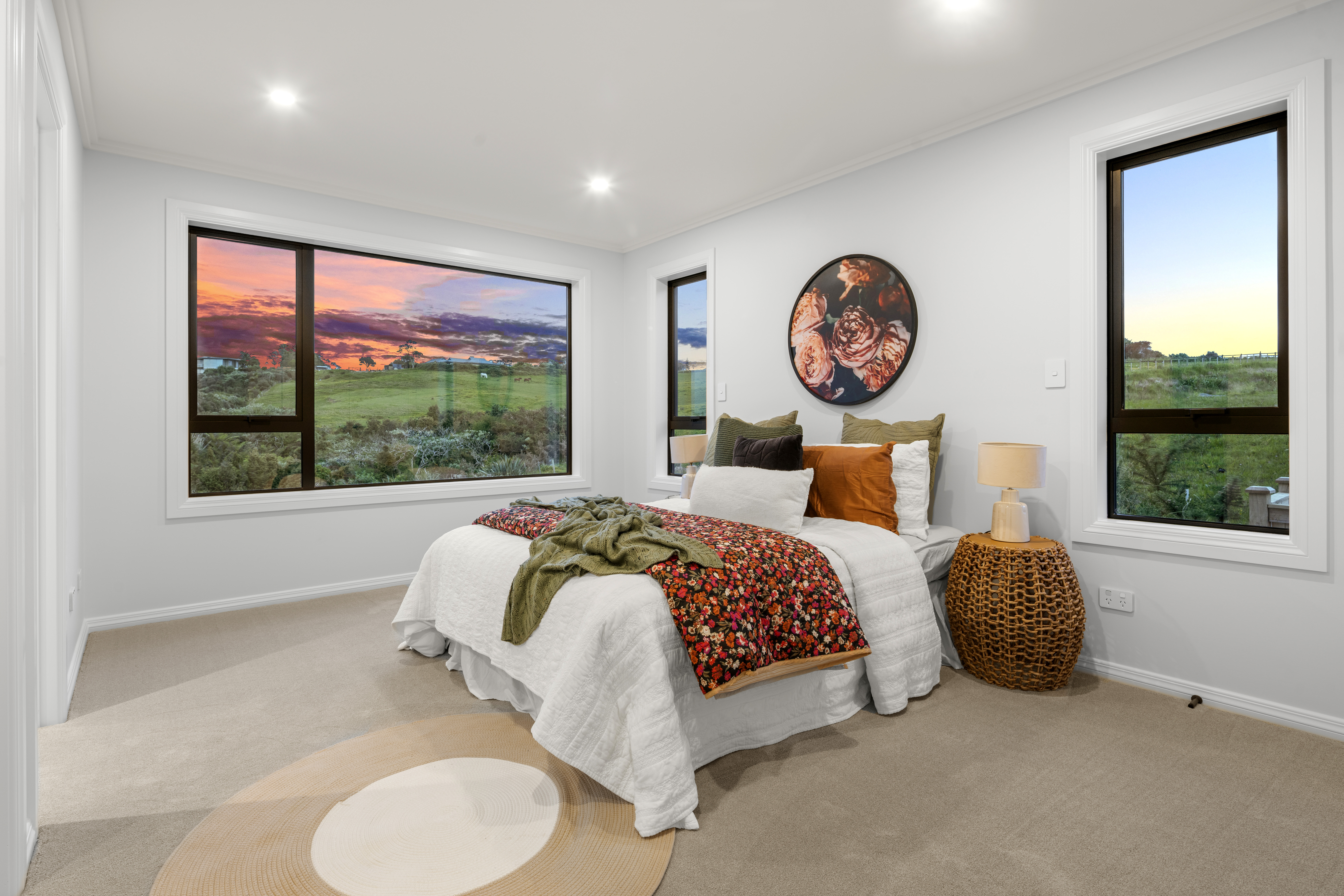 Upstairs, a family lounge or study captures outlooks to the fields and native bush. The second bedroom offers a luxurious en-suite with bath and shower plus a WIR, while the third and fourth bedrooms also feature en-suites and WIRs. A separate toilet adds convenience.