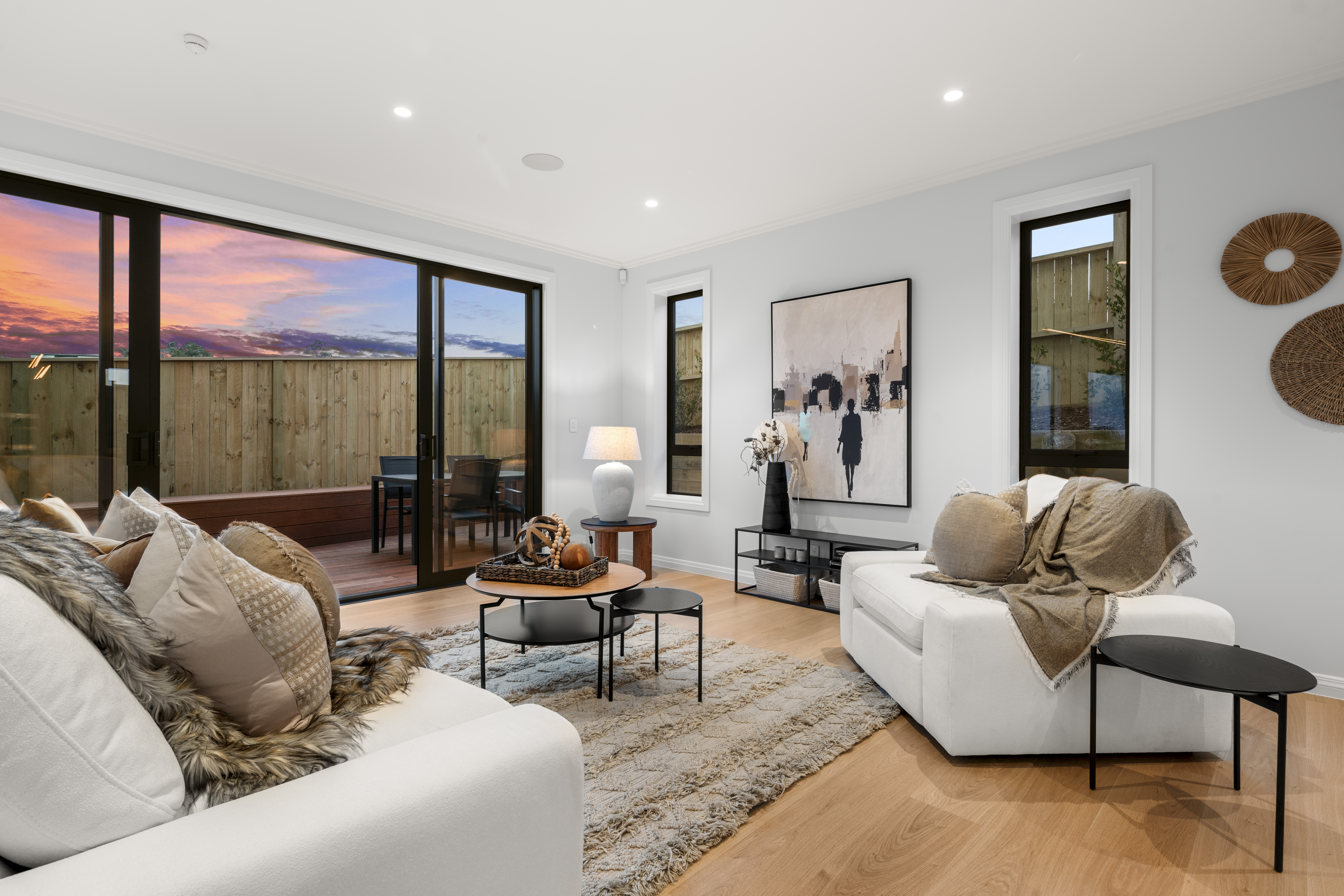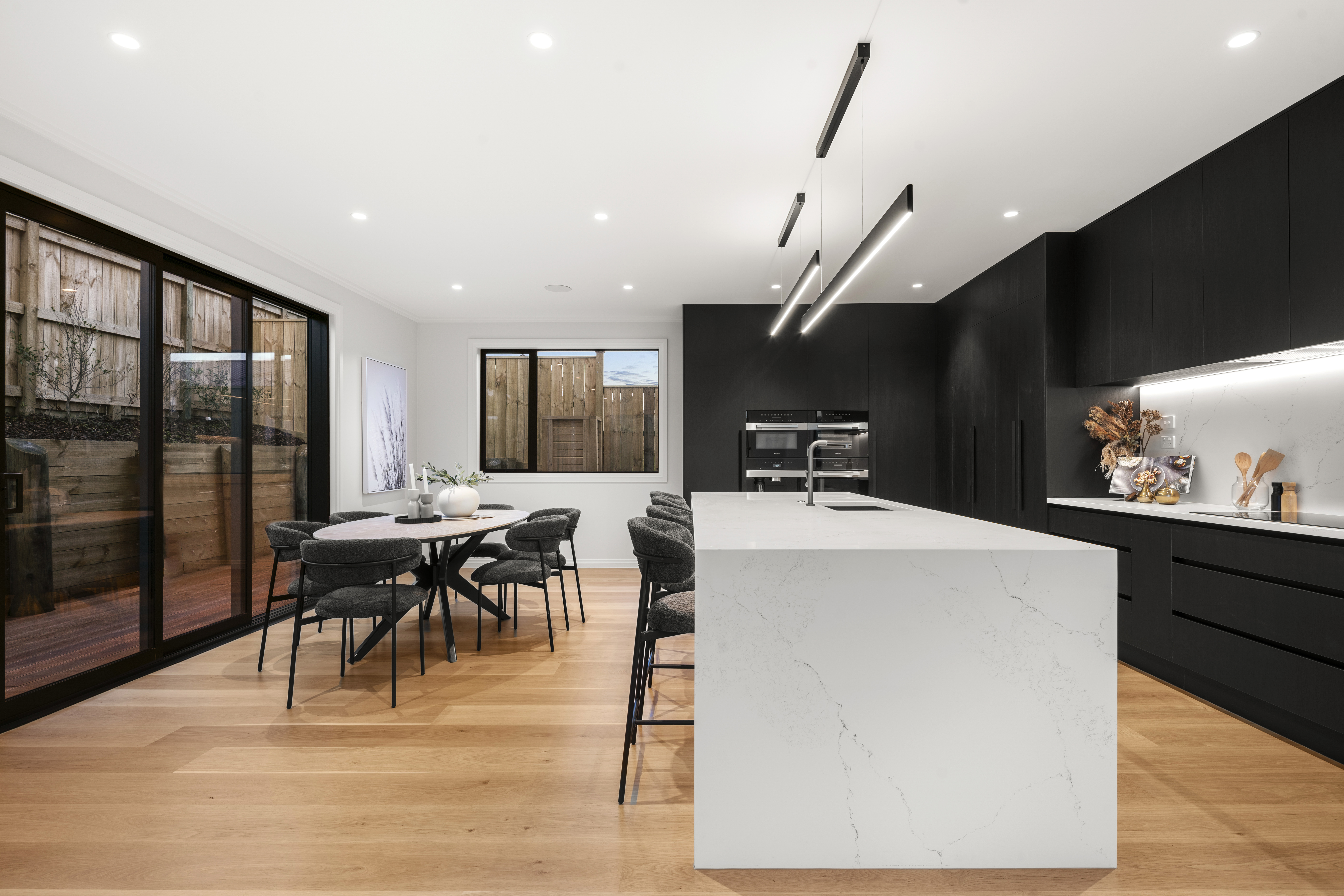 The heart of the home is a beautiful black designer kitchen with premium Miele appliances - electric hob, built-in coffee machine, fridge/freezer, two ovens, and microwave. A hidden scullery with gas hob and sink ensures effortless entertaining, while the open-plan living area flows to a private deck overlooking greenery.