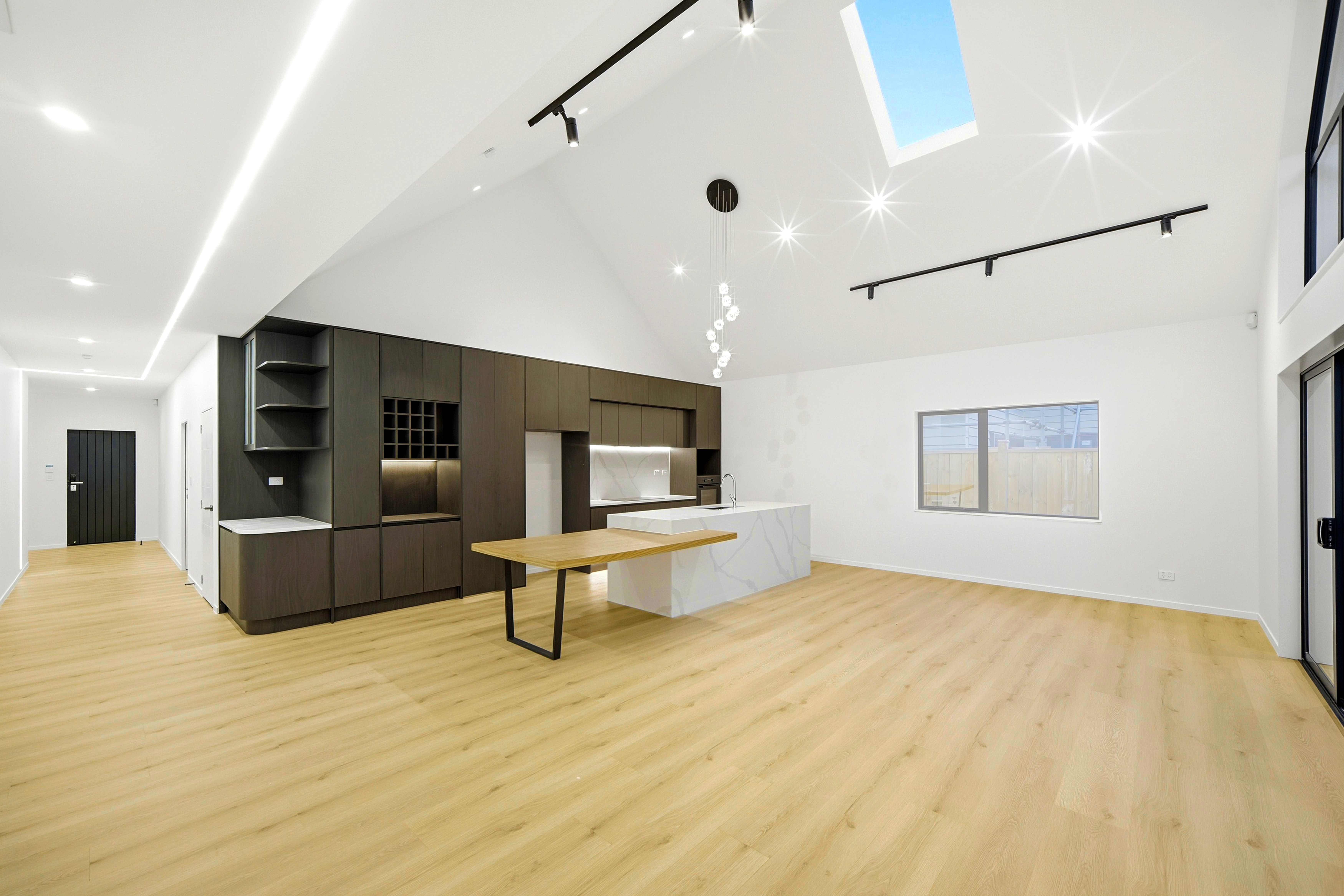 - Contemporary single-level home with a light, open feel - High peaked ceilings and skylights in the main living area - Designer black kitchen with built-in dining, Miele appliances, wine rack, and bar space - Hidden butler's pantry with Robam gas hob, sink, and outdoor access - Seamless flow to deck and low-maintenance faux lawn - Separate front family lounge - Large bedrooms, including master with WIR, ensuite, and deck access - Family bathroom with bath and separate shower - Double internal-access garage plus versatile room above (ideal for playroom, office, or storage) - Security system and feature lighting throughout